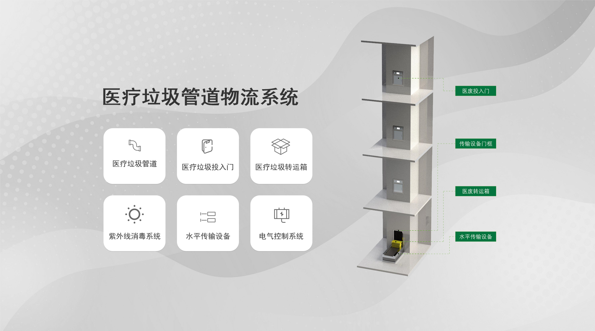 系統(tǒng)簡介:通過氣力式輸送管道對醫(yī)院內(nèi)的垃圾和污衣被服進行收集,是一種對垃圾實行全封閉、壓縮化、集裝化收運的現(xiàn)代垃圾運輸及匯集方式...
